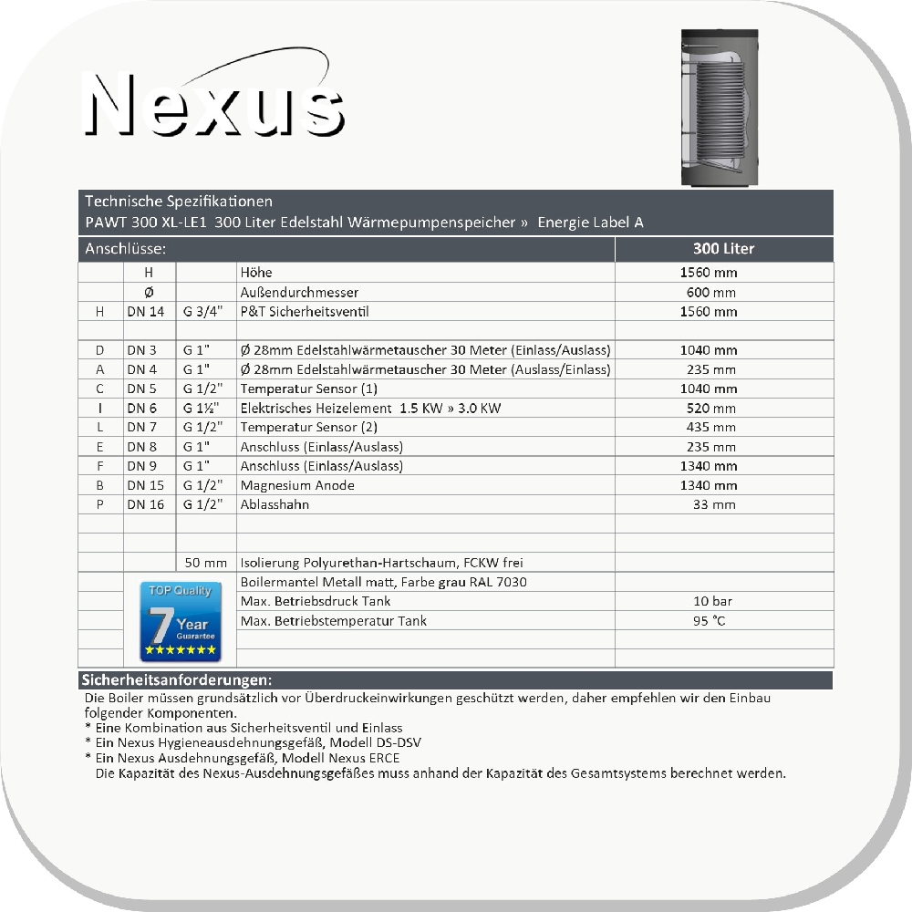 PAWT-300 XL-LE1 Edelstahl Hygienespeicher mit hocheffizientem Edelstahlwärmetauscher Produktspezifikation: Die NEXUS™ Warmwasserspeicher erfüllen die höchsten Anforderungen der PED-Druckgeräterichtlinie 97/23 / EG / CE-Zertifikat Nr. PCIN080617 und ETL-Zertifikat. Mit der fortschrittlichen Schweißtechnik haben die Boiler ein international hohes nachhaltiges Qualitätsniveau, ein sehr elegantes Aussehen und eine hervorragende Korrosionsbeständigkeit. Merkmale: Duplex Edelstahl 2304 23 % Chrom, 4 % Nickel, molybdänfreier Duplex-Edelstahl. Die Legierung 2304 hat vergleichbare Korrosionsschutzeigenschaften wie der Edelstahl 316L. Allerdings sind die mechanischen Eigenschaften, wie die Streckgrenze, doppelt so hoch wie bei Edelstahl 304 & 316L.