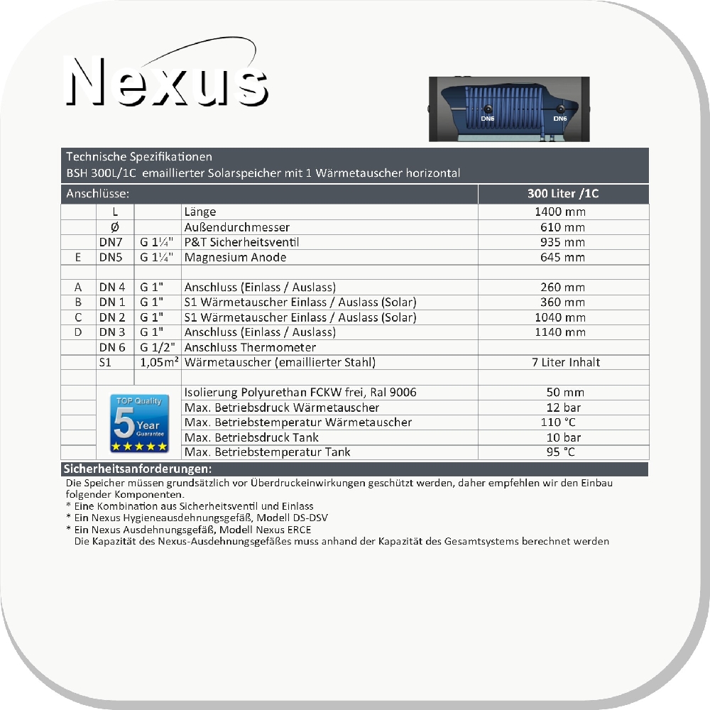 BSH1-300 Liter emaillierter Solarspeicher mit 1 Wärmetauscher (horizontal) Produktspezifikation: Merkmale: Emaillierte Beschichtung Emaille hat viele hervorragende Eigenschaften: Es ist glatt, hart, chemisch beständig, langlebig, kratzfest (5-6 auf der Mohs-Skala) er ist leicht zu reinigen. Emaillierte Warmwasserspeicher werden bevorzugt für die Speicherung von heißem oder kaltem Wasser verwendet. Die Emailleschicht sorgt für eine dauerhafte Nutzung und hält den Auswirkungen der hohen Wassertemperatur stand. Die NEXUS™ Solar-Warmwasserspeicher erfüllen die höchsten Anforderungen der PED-Druckgeräterichtlinie 97/23/EG EN12897.