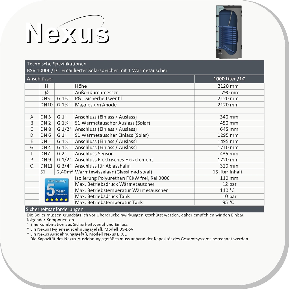 BSV 1000 Liter Emaillierter Solarspeicher mit 1 Wärmetauscher Produktspezifikation: Merkmale: Emaillierte Beschichtung Emaille hat viele hervorragende Eigenschaften: Es ist glatt, hart, chemisch beständig, langlebig, kratzfest (5-6 auf der Mohs-Skala) er ist leicht zu reinigen. Emaillierte Warmwasserspeicher werden bevorzugt für die Speicherung von heißem oder kaltem Wasser verwendet. Die Emailleschicht sorgt für eine dauerhafte Nutzung und hält den Auswirkungen der hohen Wassertemperatur stand. Die NEXUS™ Solar-Warmwasserspeicher erfüllen die höchsten Anforderungen der PED-Druckgeräterichtlinie 97/23/EG EN12897.